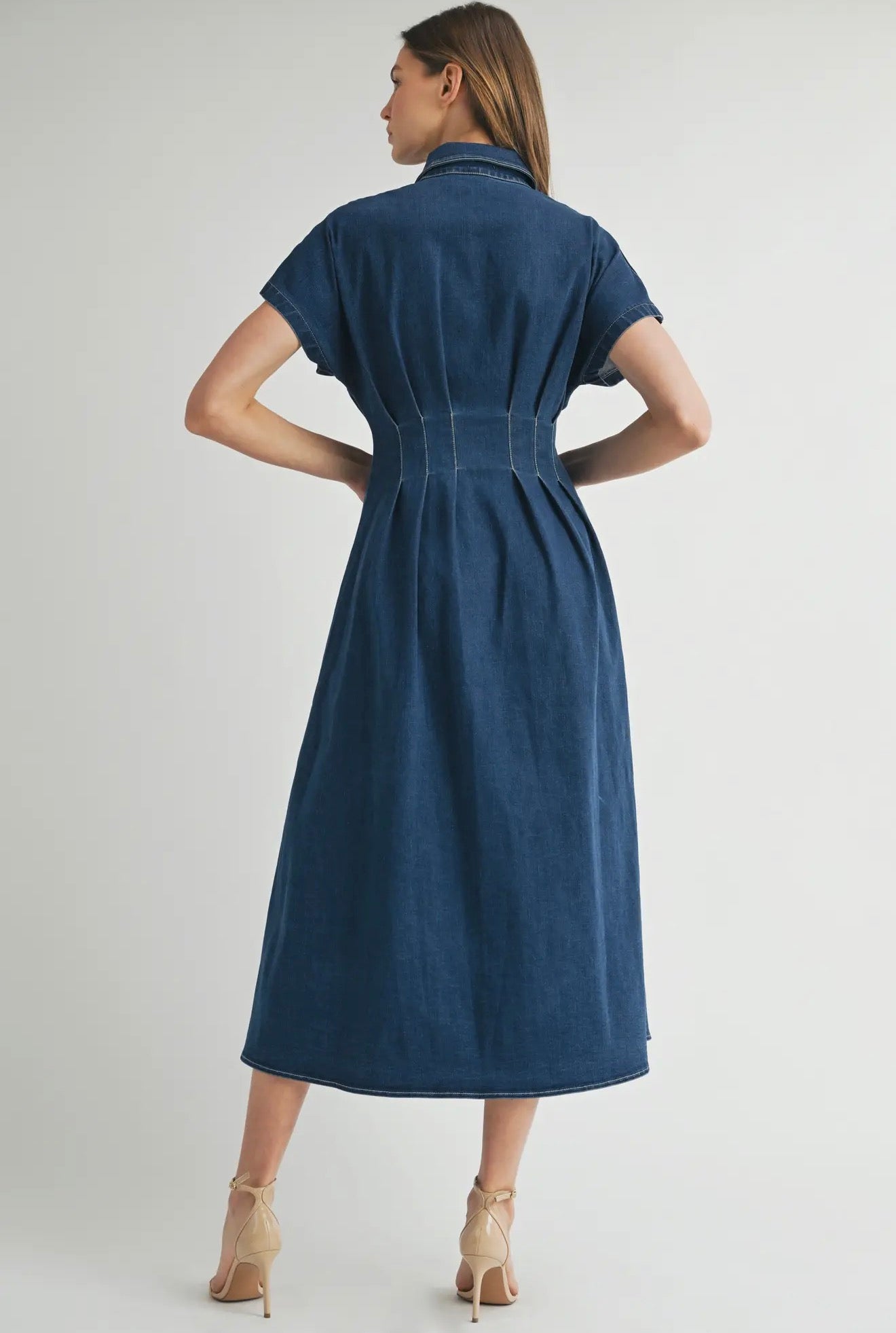 This dark denim midi dress blends structure with femininity.