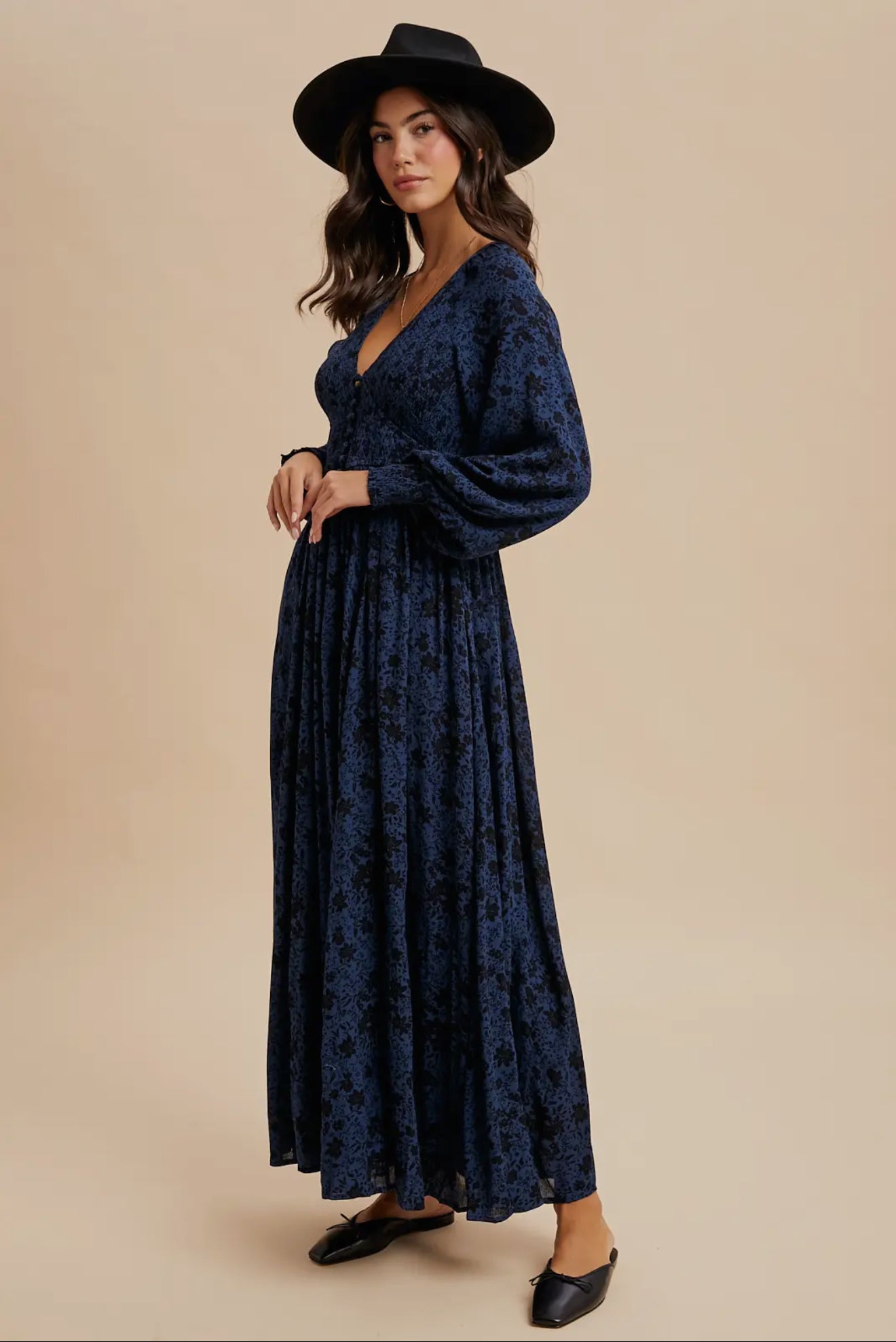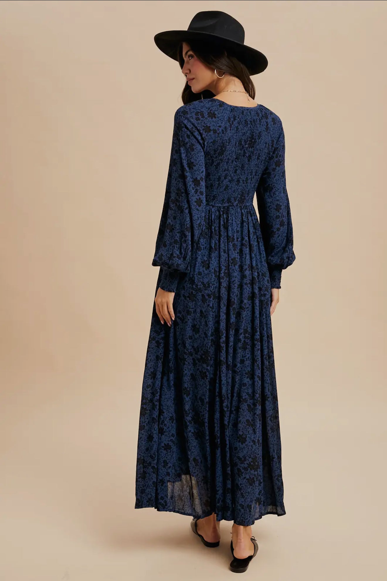AILANY SMOCKED FLORAL MAXI DRESS IN NAVY