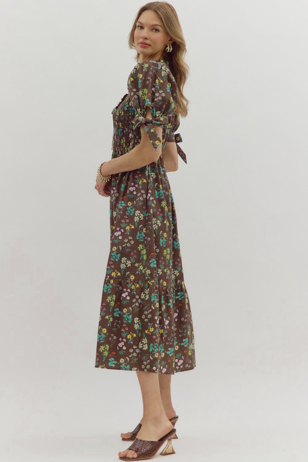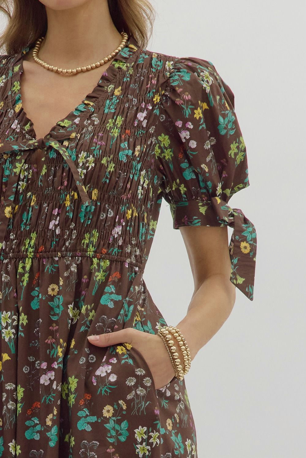 Multi-floral print bow tie band short sleeve midi dress featuring front smocked V-neck bow tie closure. Elasticated waist. Side pockets. Lined. Woven. Non-sheer. Lightweight.