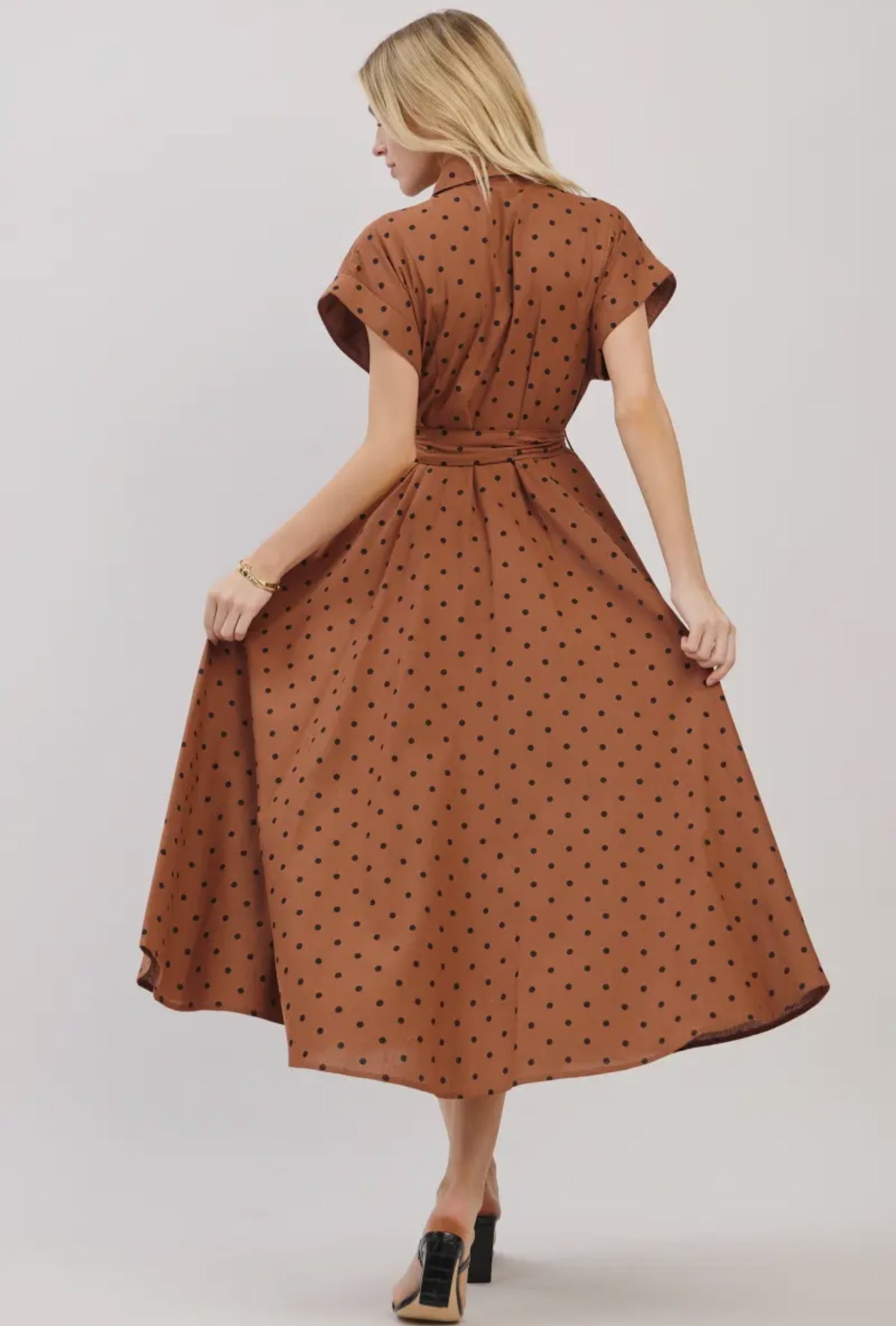 Women Woven Polka Dot Short Sleeve Button Down Maxi Dress with Self Belt and Side Invisible Pocket (Full Lining)