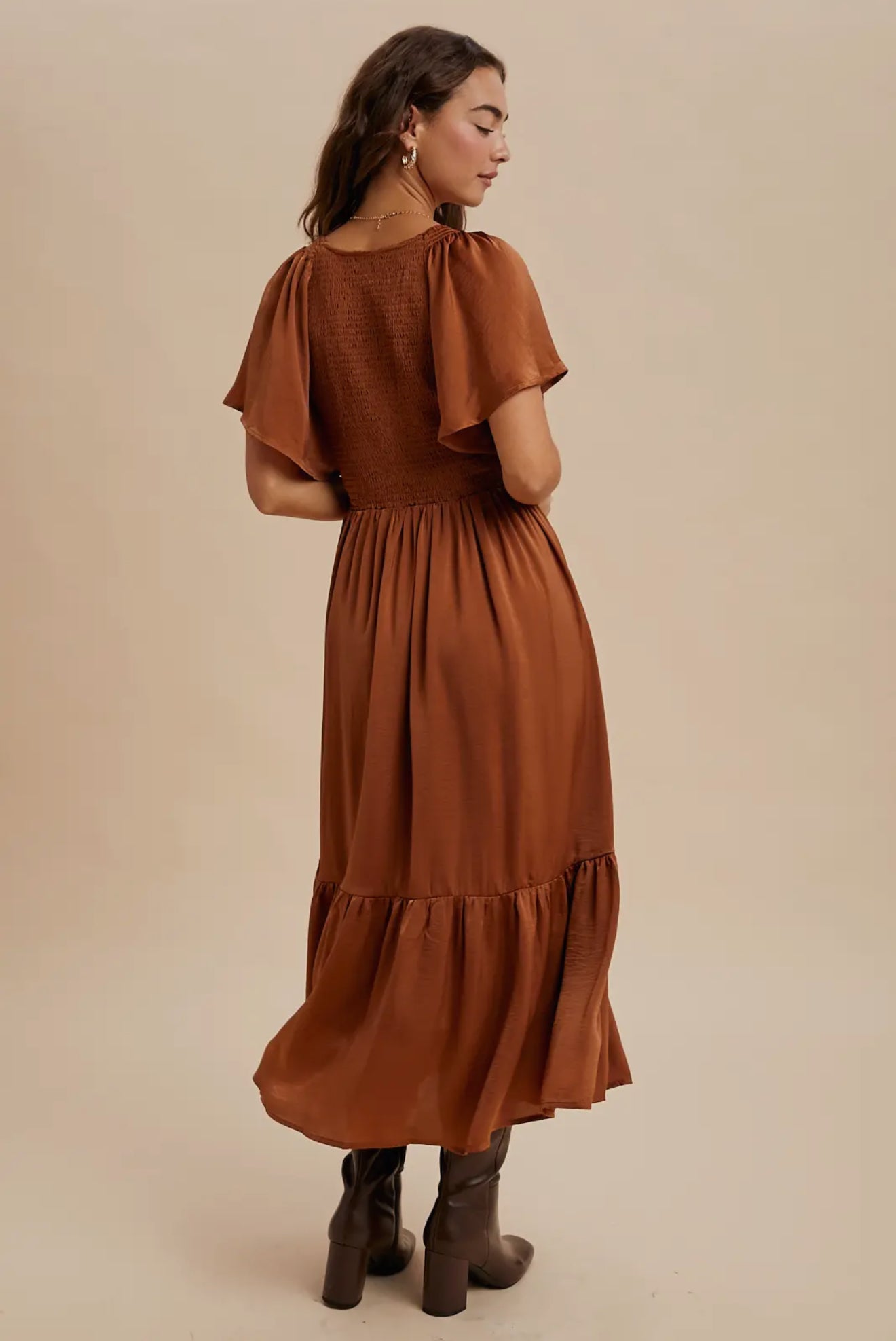 V-neck washed satin smocked body flutter sleeve midi dress with full lining.
