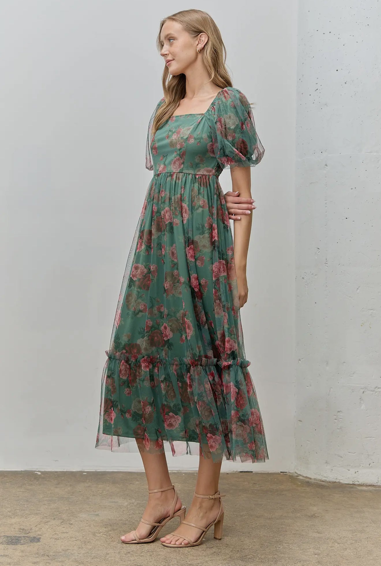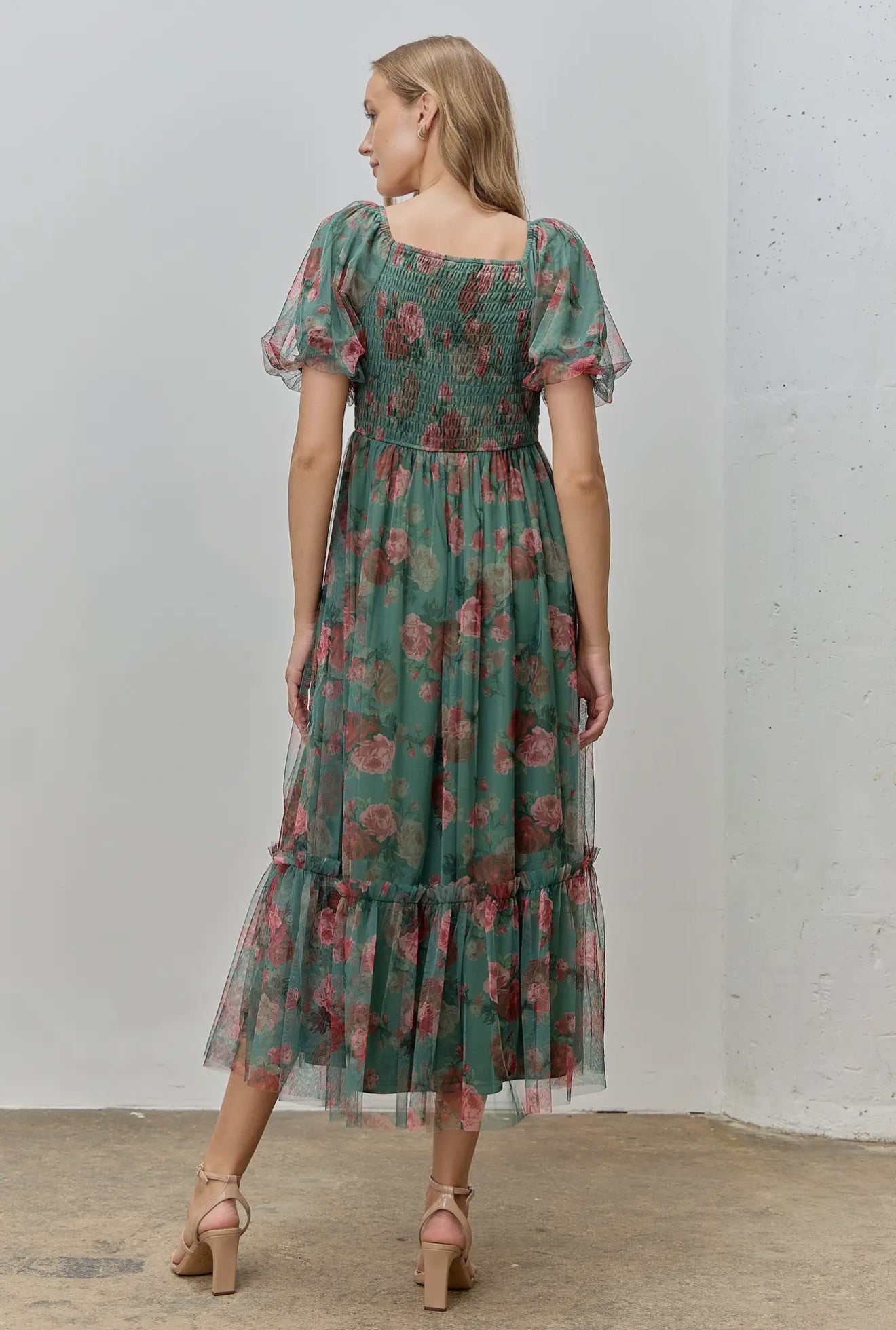 Gorgeous tulle midi dress. The skirt is tiered and midi length. This dress has a square elasticized neckline with balloon sleeves and a smocked back. The top layer is a deep green with a floral print in pink. This dress does not have pockets and is fully lined.